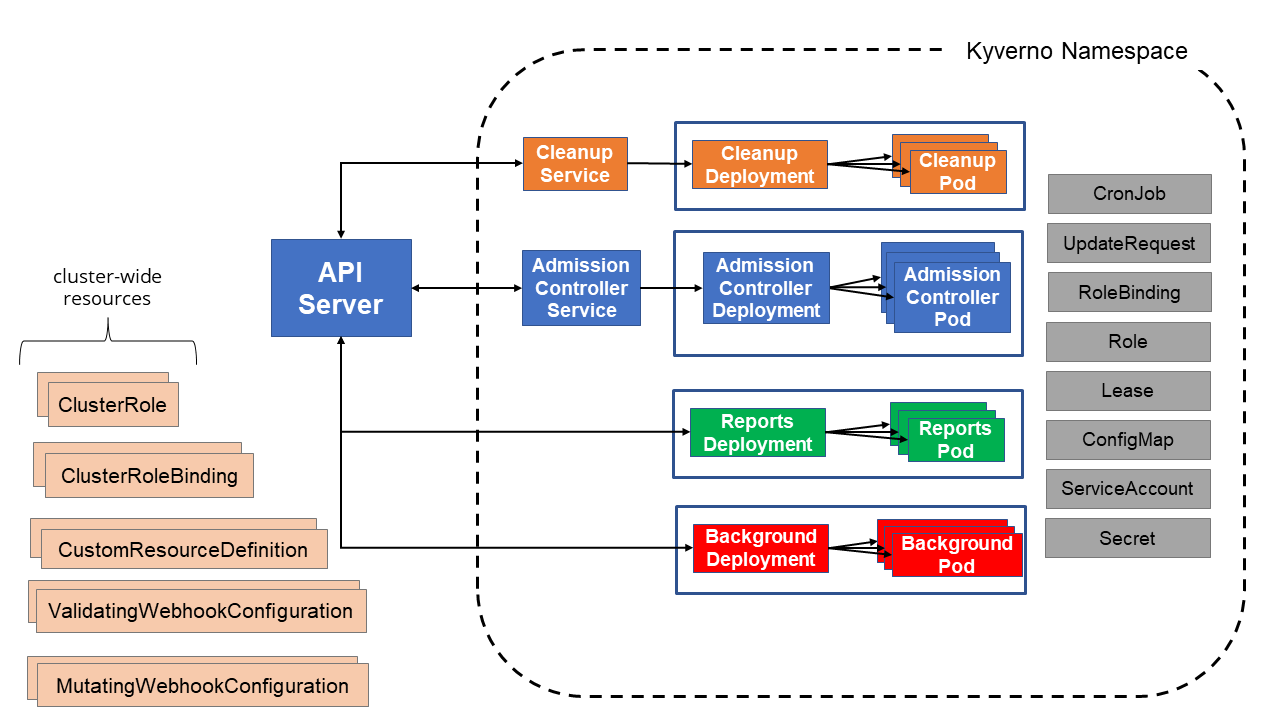 - Admission Controller: The heart of Kyverno, the Admission Controller receives and processes webhook requests from the Kubernetes API server and is responsible for validate, mutate, and verifyImages rules along with Policy Exceptions. It also performs most of the validations on policies themselves. This is the only required component of Kyverno which must be installed.
