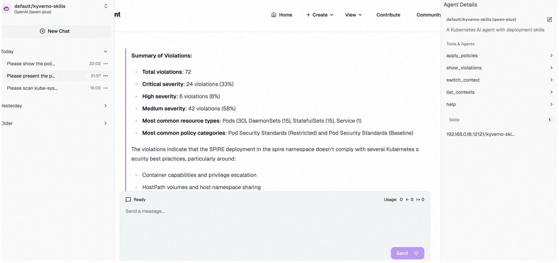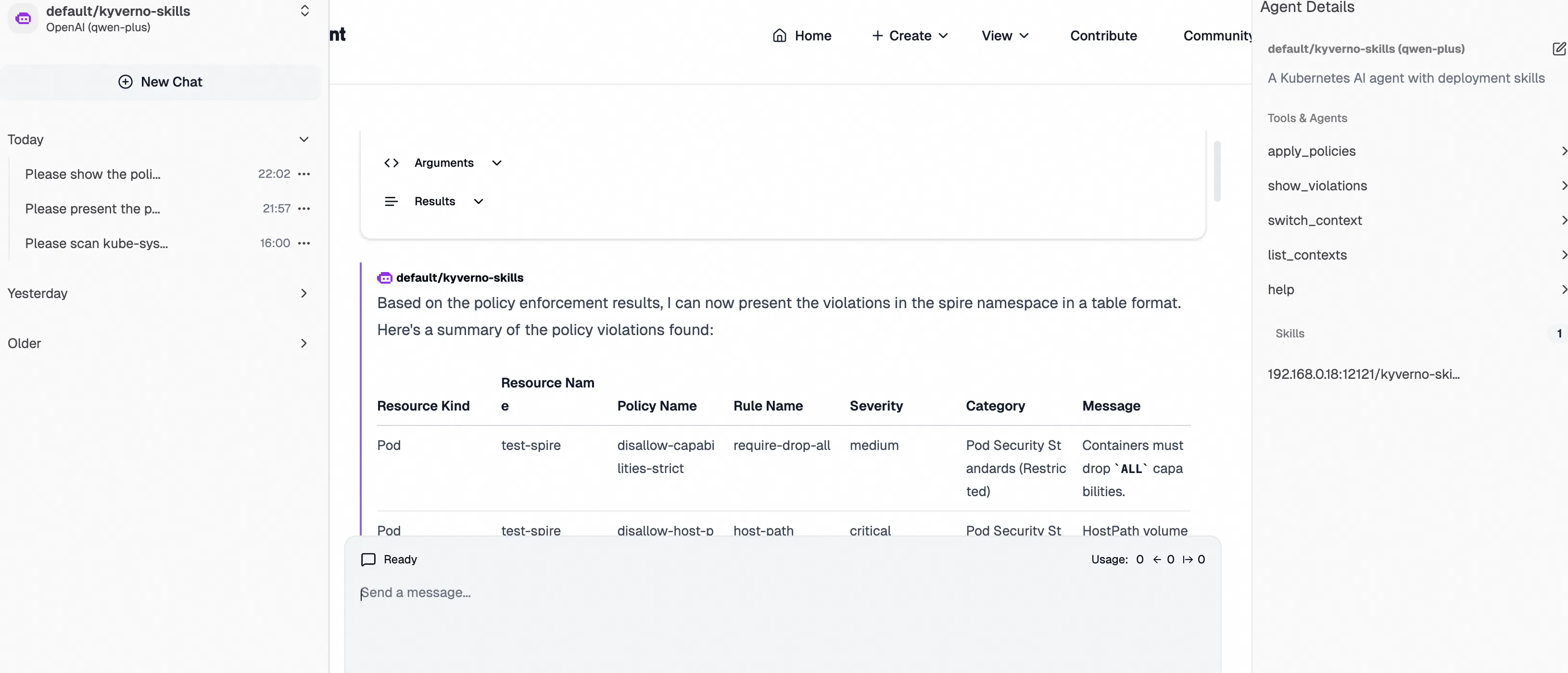 The figure below illustrates a Kyverno Agent instance deployed in the cluster. Integrated with Tools from kyverno-mcp, it supports context loading and switching across multi-cluster environments and enables policy governance inspection via the kyverno CLI for rapid security and compliance risk detection. Enhanced with Kyverno-specific Skills, the Agent optimizes policy governance workflows: as demonstrated in the interaction snapshot, it swiftly invokes Tools to evaluate namespace-level risks against best-practice policy sets, ultimately delivering tabular compliance reports and consolidated violation summaries.